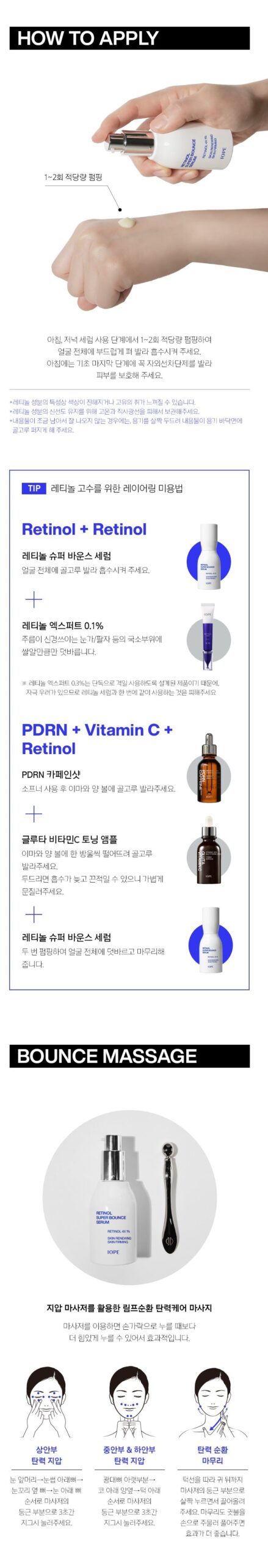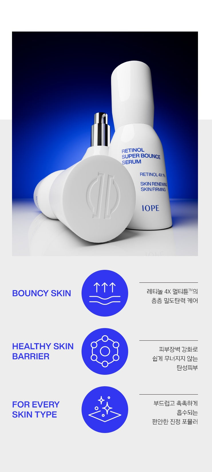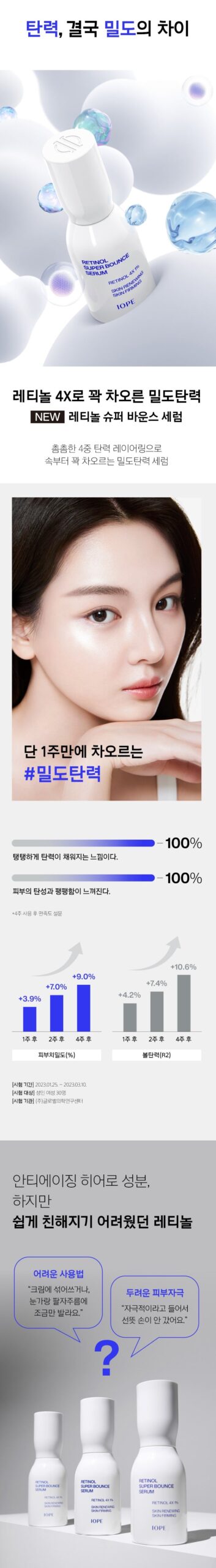 • IOPE’s unique retinol & retinoid quadruple complex formula allows for dense quadruple elasticity layering.
