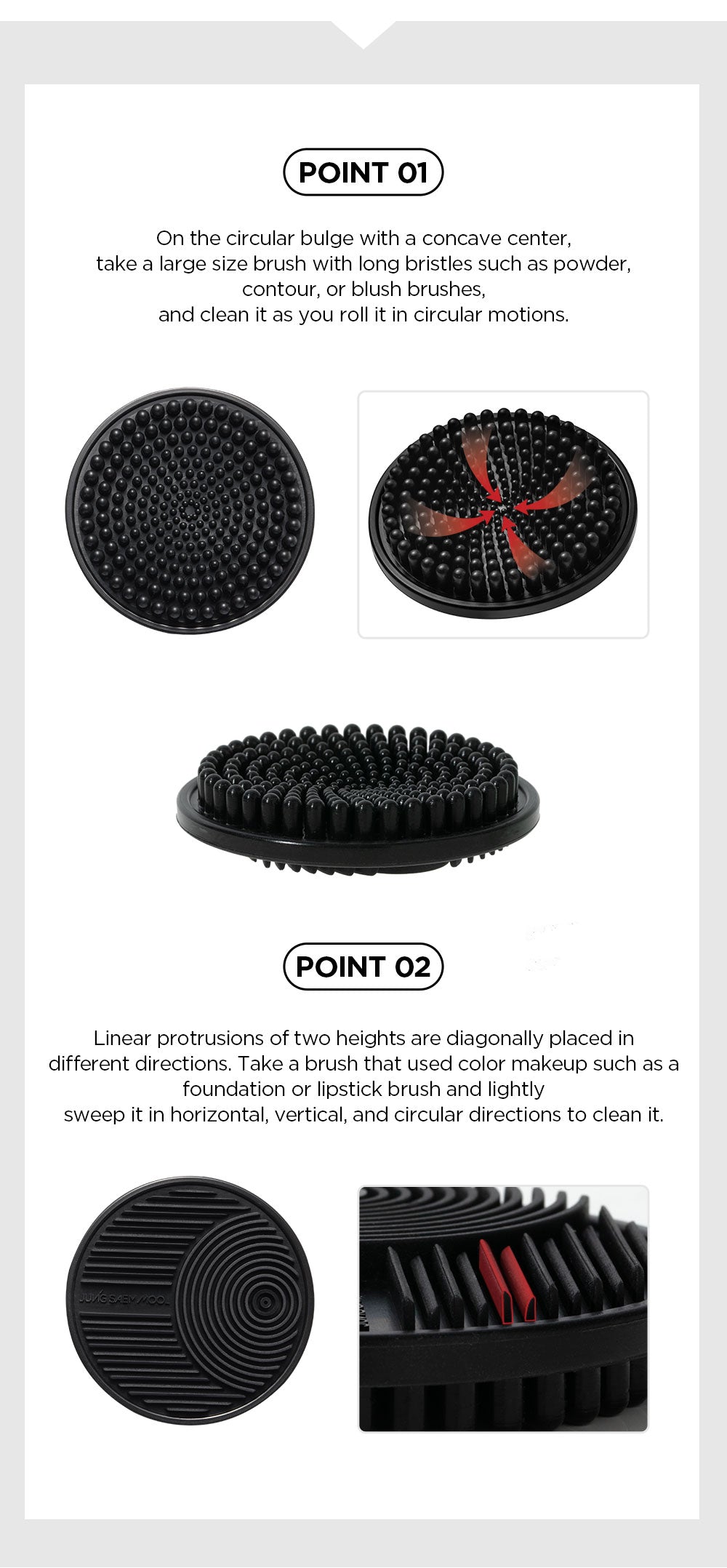 - Point 02: The linear protrusions of varying heights are placed diagonally for brushes used with color makeup, like foundation or lipstick brushes. Clean these by gently sweeping them in horizontal, vertical, and circular motions.