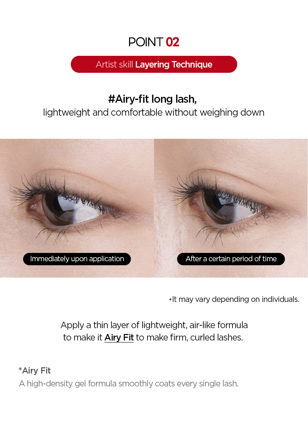 - Airy-fit long lash: Our high-density gel formula coats each lash smoothly, providing a lightweight, comfortable feel that doesn’t weigh down your lashes.