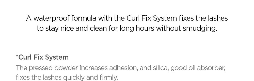 - Curl Fix System: Combining pressed powder for increased adhesion and silica for oil absorption, our waterproof formula ensures your lashes stay pristine all day without smudging.