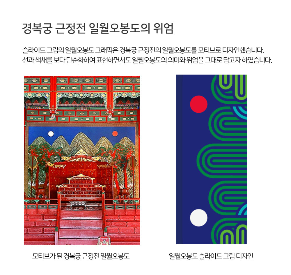 Irworobongdo Motif: A traditional painting of the sun, moon, and five peaks placed behind the king’s throne, symbolizing royal authority and harmony.