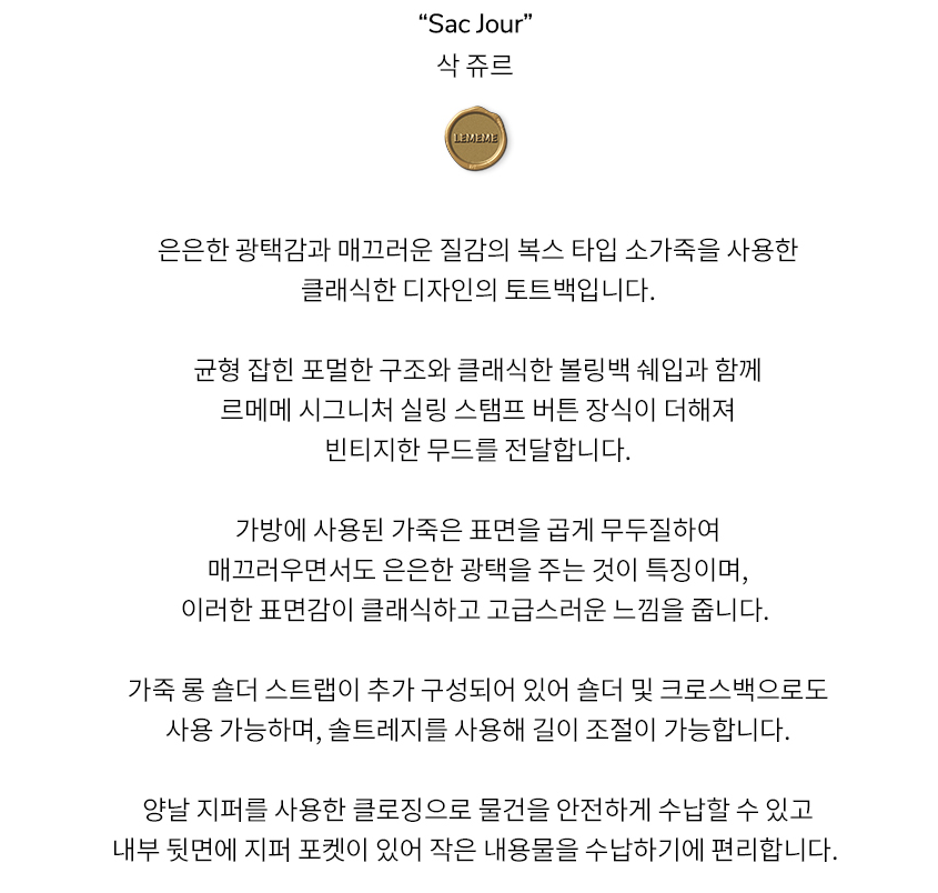 Our “Sac Jour” tote bag is a testament to LEMEME’s philosophy. Crafted from box-type cowhide leather, it showcases a classic design with a smooth texture and a subtle sheen. The bag’s formal structure and classic bowling bag silhouette are enhanced by LEMEME’s signature sealing stamp button decoration, echoing a vintage charm.