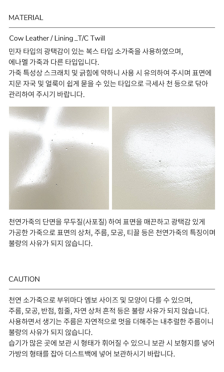 Crafted from box-type cowhide leather distinct from enamel leather, our tote offers a smooth and glossy finish. As natural leather is prone to scratches and scuffs, careful handling is advised. Regular maintenance with a microfiber cloth is recommended to preserve its elegant appearance. Natural characteristics such as surface scratches, wrinkles, and pores underline the leather’s authenticity and should not be seen as defects.