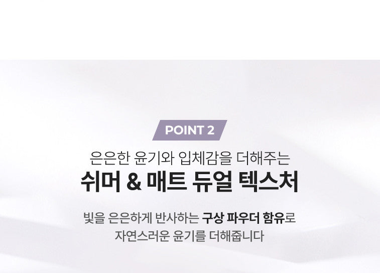 Infused with spherical powder that reflects light subtly, the shimmer finish enhances a natural glow, while the matte texture provides a smooth base. Together, they create a radiant and dimensional look.