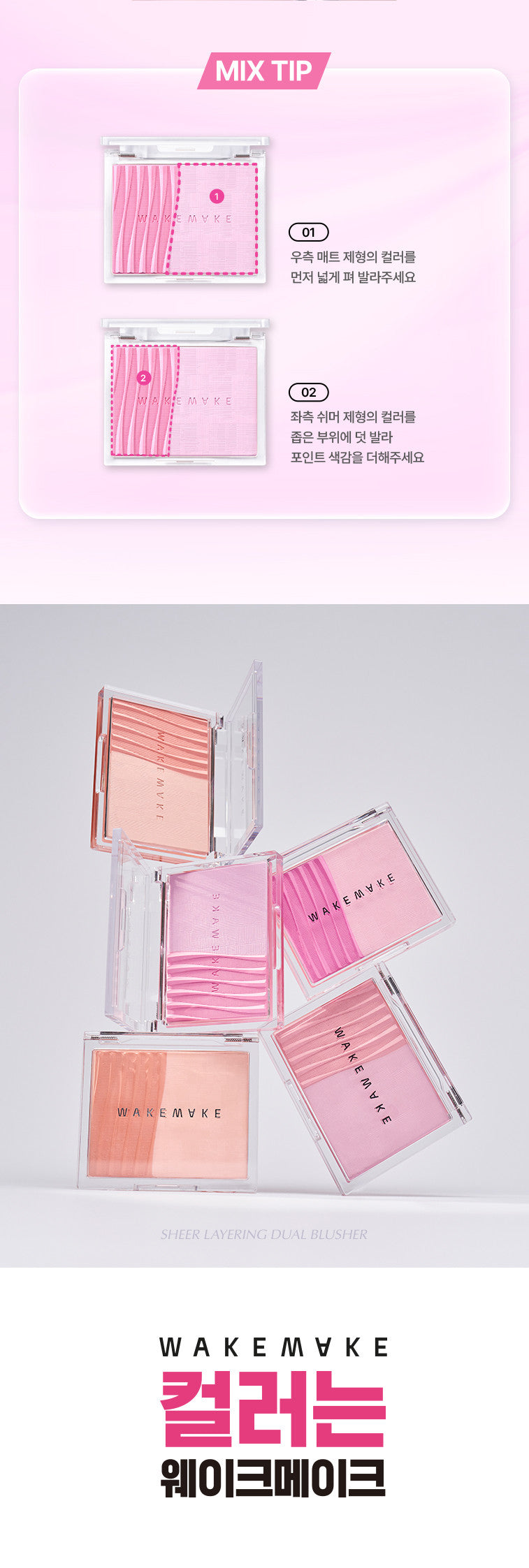 Achieve a watercolor-like, sheer, and transparent glow with the WAKEMAKE Sheer Layering Dual Blusher. Featuring a silky touch and natural pigmentation, this dual-color blush creates a soft and subtle look that intensifies beautifully with layering.