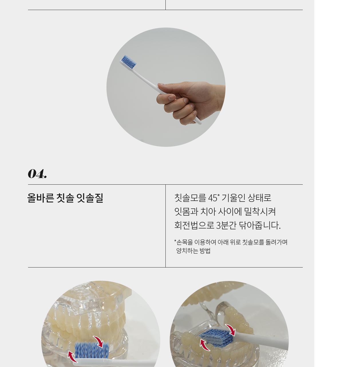 - Tilt the toothbrush bristles at a 45º angle, brushing between the gums and teeth using a circular motion for approximately 3 minutes.