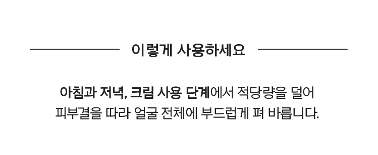 In the morning and evening, at the cream application stage, take an appropriate amount and gently spread over the entire face along the skin texture.