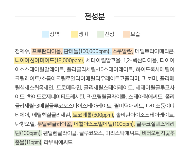 Purified water, propanediol, panthenol (100,000 ppm), squalane, methyl trimethicone, niacinamide (18.000 ppm). Cetearyl alcohol, 1.2-lexanediol, diisostearyl malate, polyglyceryl-10 stearate, hydroxyethyl acrylate thiiso, etc. Acryloyl dimile taurate copolymer, carbomer, polymethyl Silsesquioxane, troethamine, glyceryl stearate, cetearyl glucoside, hydrogenatedresidin, caprylyl glycol, stearic acid, polyglyceryl-30% tylglucose dastearate , Dalmitic Maced, Disodium ED ES A adelexyl glycerin, tocopherol (300ppm), sorbidan isostearate, danhyang oil, butylene glycol, ethylascobyl edel (100ppm), glucosylhesperidan (100piom), panthylene glycol, glucose, myristic acid, bitter orange flower extract (11ppm), lauric acid
