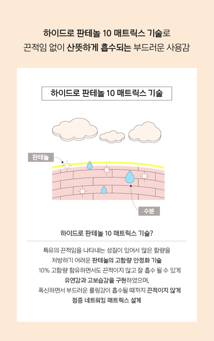 Although it contains 10% high content, it is not sticky and has a feeling of flexibility and high moisture so that it can be absorbed well, and the design of a networking matrix that is not sticky until a soft and soft rolling feeling is absorbed