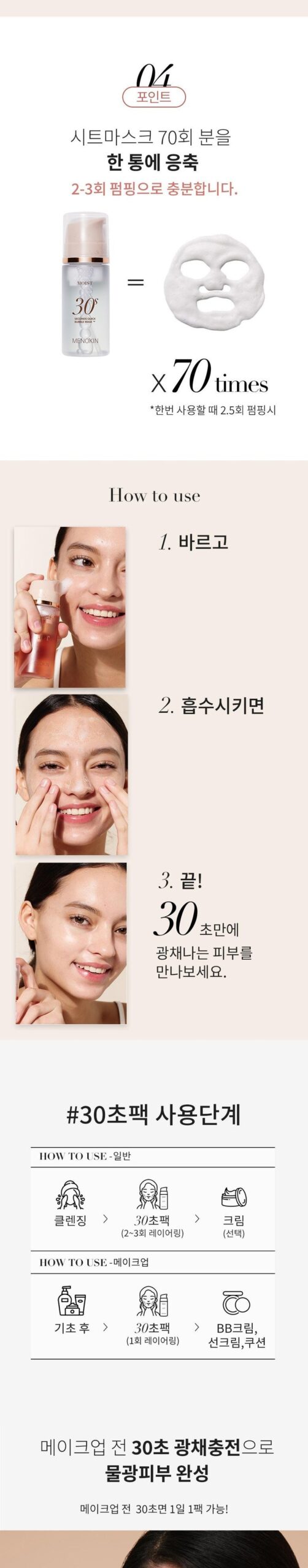 - After applying your base, use a single layer of the 30-second pack → Follow with BB cream, sunscreen, or cushion makeup. Achieve a dewy, radiant finish in just 30 seconds!