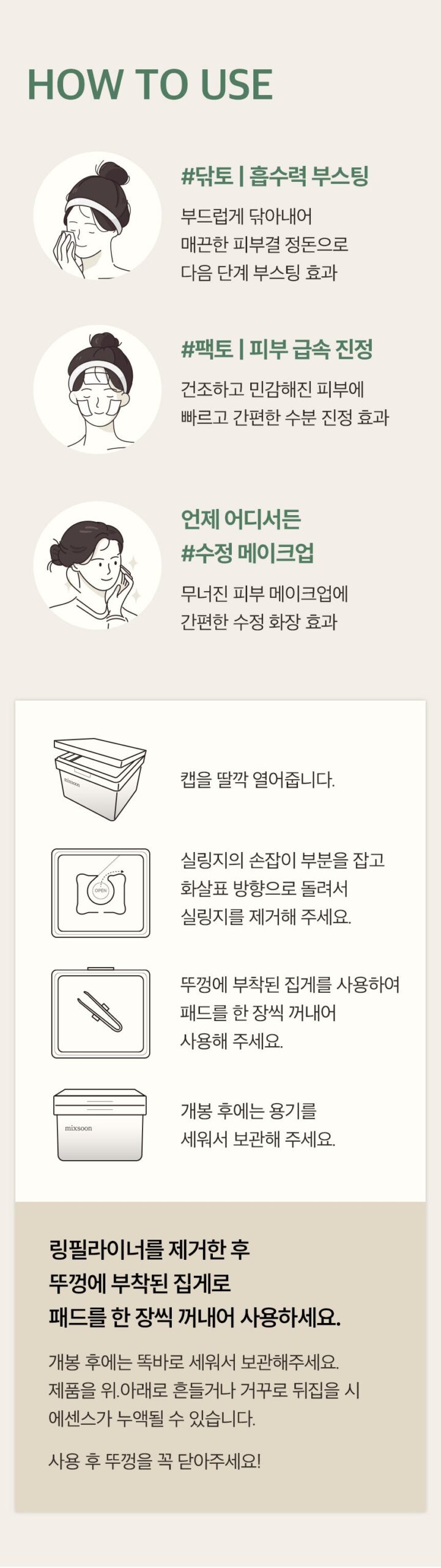 最近、mixsoonのビーントナーパッドを試してみたよ!使ってびっくりしたんだけど、本当にサッパリするし、お肌がもっちりになる感じ。洗顔後にこれをさっと一枚使うと、一気に水分補給できるから乾燥とは無縁になれそう。敏感肌でも全然大丈夫で、優しくケアしてくれる感じがいいね。このソイエキスのおかげかな?滑らかなお肌が続いて嬉しい限りだよ!