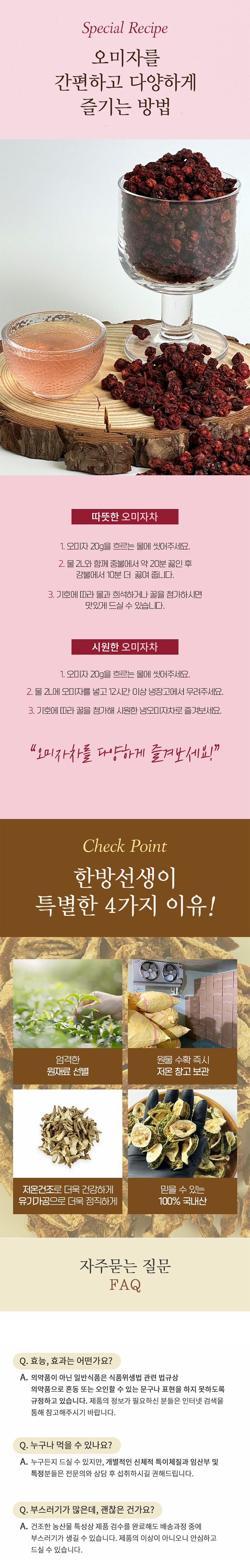 Enjoy Omija in every season: refreshing as a chilled tea in summer, or soothing as a warm tea in winter. It also adds a distinctive taste and color to various dishes.