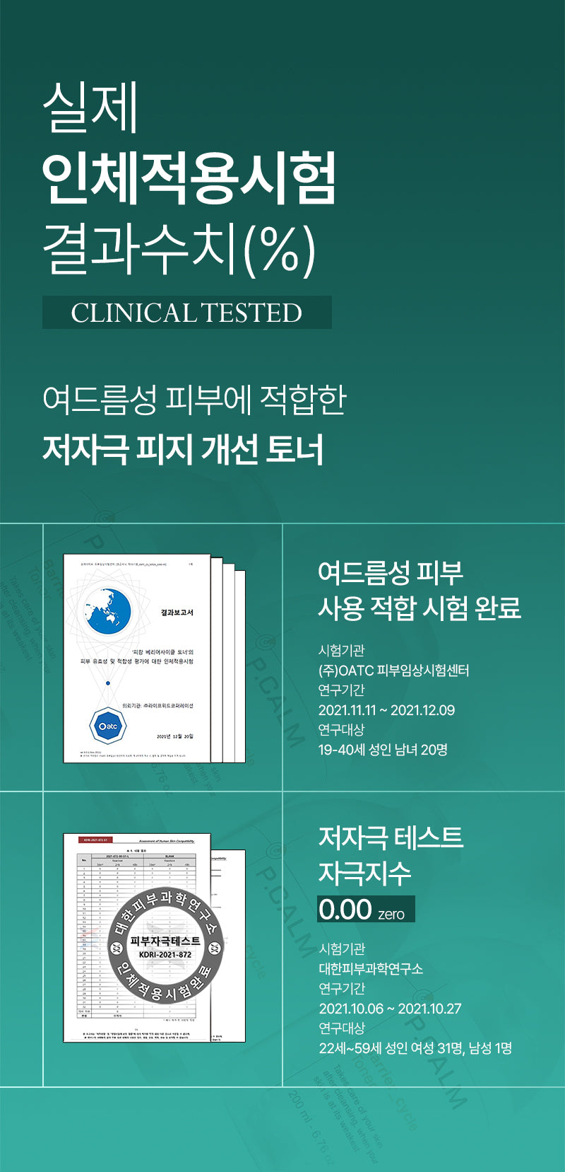 The P.CALM Barrier Cycle Toner is more than just gentle—it’s clinically proven. With a skin irritation index of 0.00, it has completed 7 types of human clinical trials, including evaluations by university hospital specialists. This toner is recognized by the Ministry of Food and Drug Safety for its dual functionality in skin brightening and wrinkle improvement.