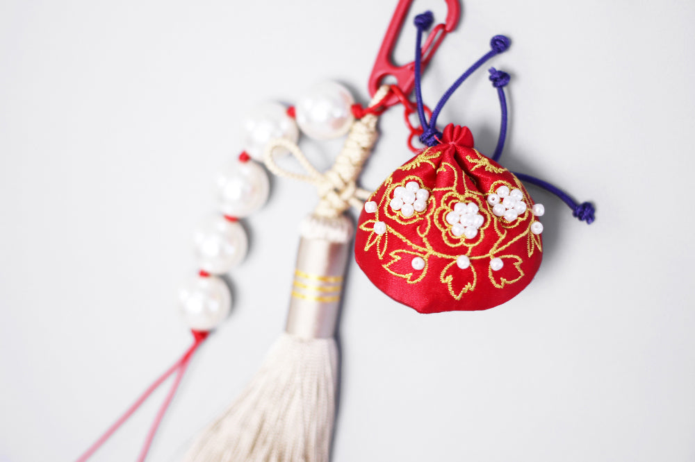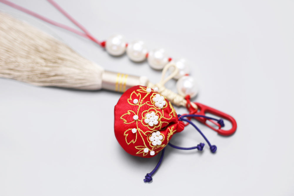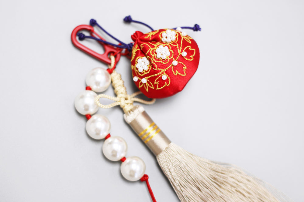Traditionally worn with the three-line norigae on the ceremonial attire of queens, concubines, and princesses, the pearl pocket is a symbol of grace, nobility, and feminine elegance. Its richly embroidered pocket with gold thread, adorned with imitation pearls and infused with a subtle fragrance, evokes the opulence of the royal court.