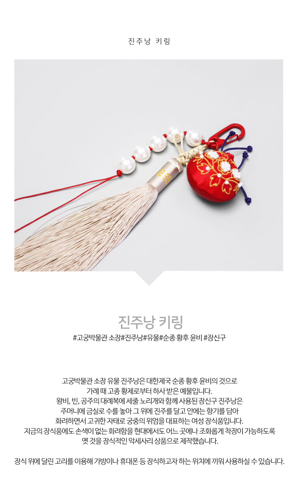 I purchased the K-Heritage Pearl Pocket Keyring, intrigued by its rich history as a tribute to Korean imperial elegance. The imitation pearls are beautifully arranged against a gold-thread embroidered pocket, adding an air of sophistication to my keys. Additionally, I love that it subtly fragrances the items I keep inside. Carrying this piece feels like having a slice of royal heritage with me every day; it’s not just functional but also quite enchanting and stylish.