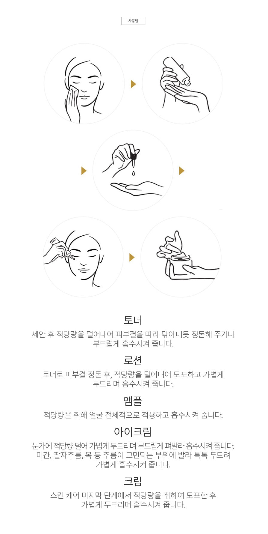 After washing the lotion ampoule cream toner, remove an appropriate amount and wipe it off according to the skin texture, or gently absorb it. After you clean up your skin with toner, apply an appropriate amount and tap lightly to absorb it. Take an appropriate amount and apply it all over your face and absorb it. Apply an appropriate amount around the eye cream and gently pat it to absorb it. Apply it to areas where wrinkles are concerned, such as the forehead, nasolabial folds, and neck, and gently tap it to absorb. At the last step of skin care, take an appropriate amount, apply it, and tap lightly to absorb it.