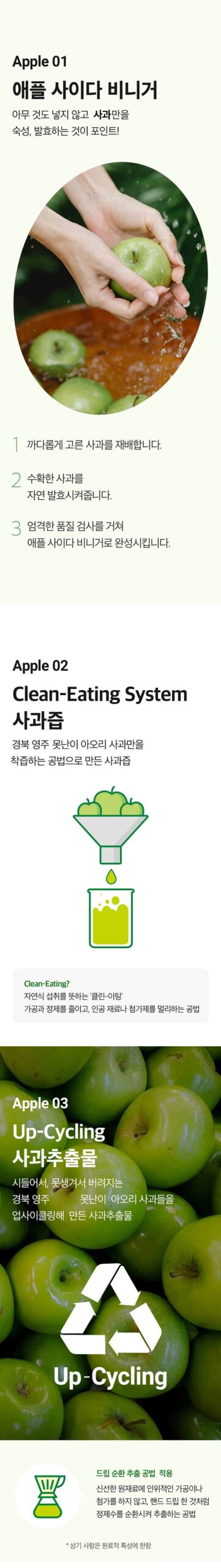 - Features clean-eating apple juice, crafted from organic Aori apples in Korea, using no additives.