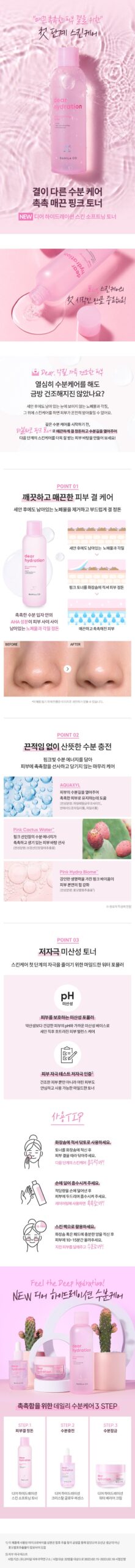 BANILA CO Dear Hydration Skin Clearing Toner balances, hydrates, and smooths skin texture promoting a clear complexion.