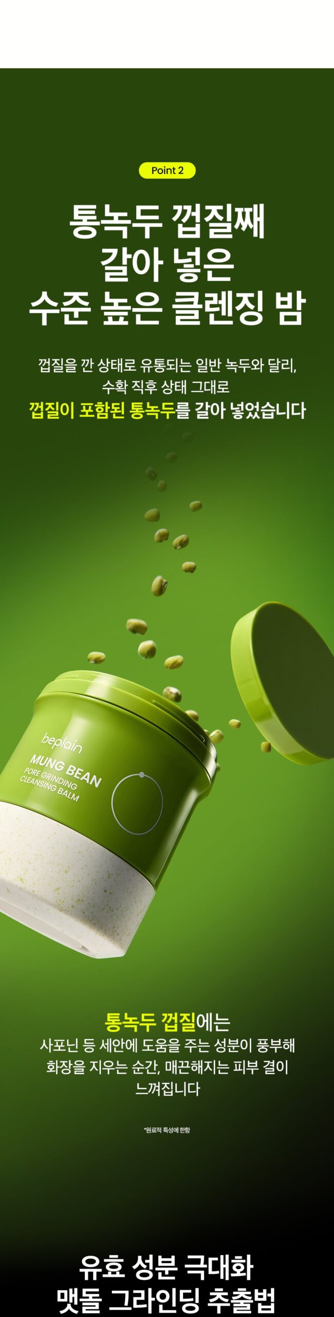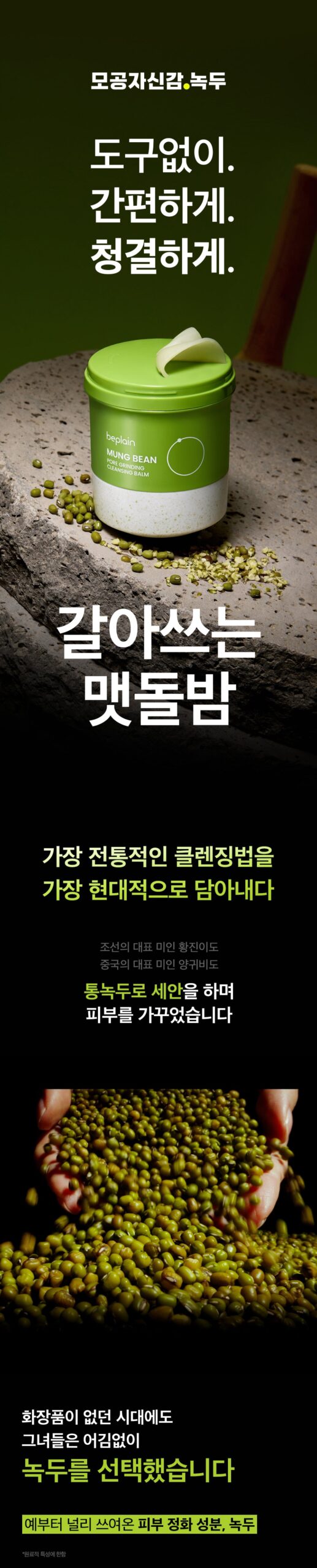 - Whole Mung Beans: Unlike common mung beans that are peeled, this product uses whole mung beans ground with their skins immediately after harvest. Rich in saponins and other cleansing agents, they enhance the product’s cleansing effectiveness.