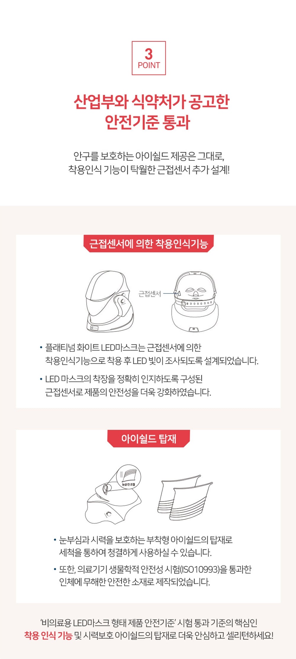 - Integrated Eye Shield to protect vision from direct LED exposure, made from ISO 10993-tested, skin-safe materials.