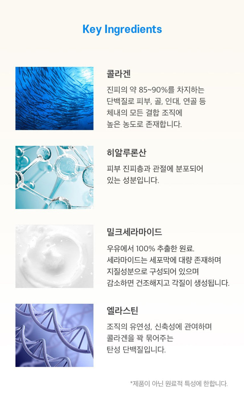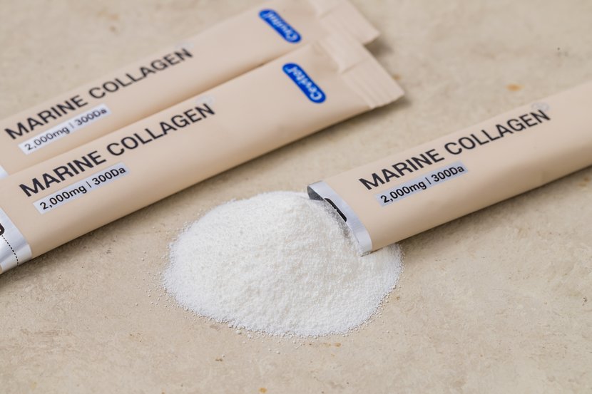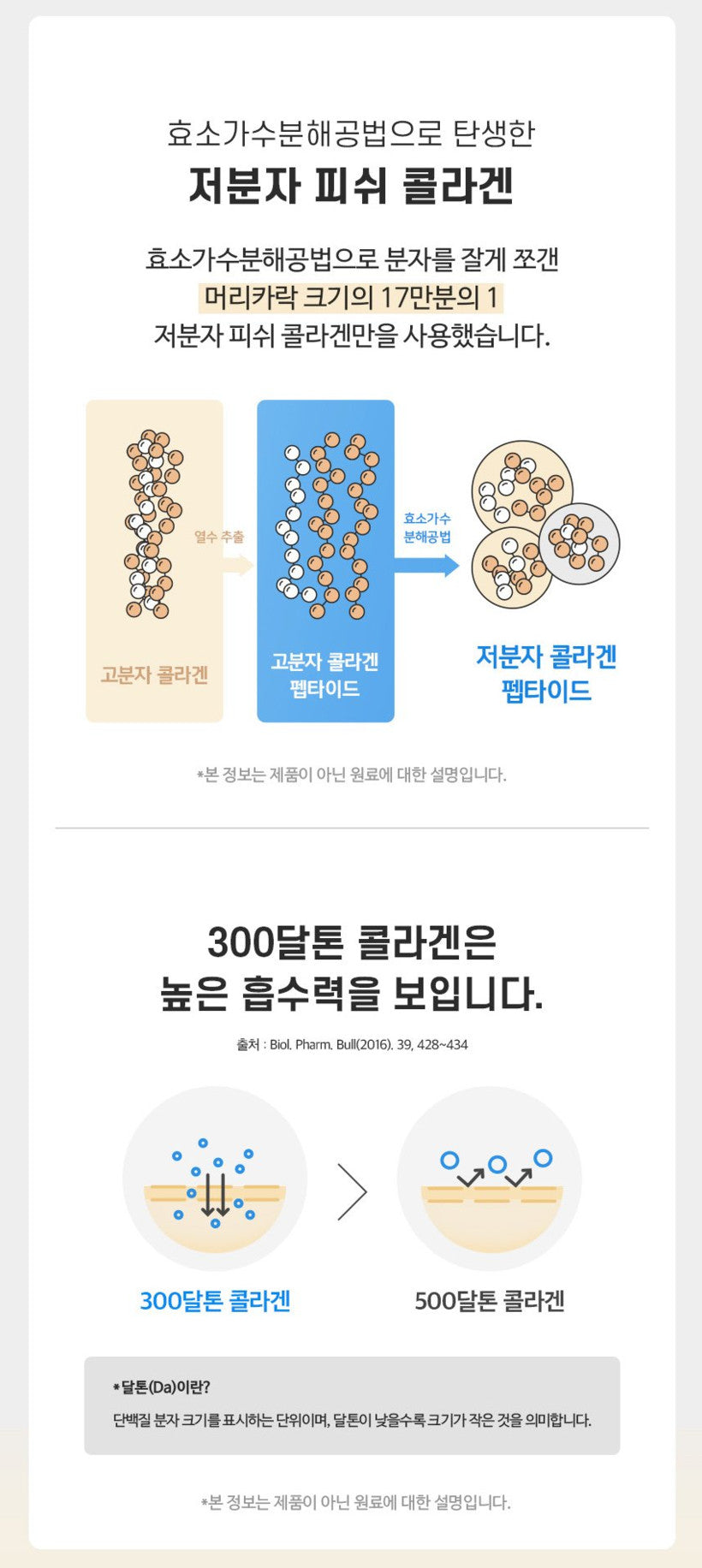 We used only low-molecular-weight fish collagen, 1/170,000 the size of a human hair, whose molecules were split into small pieces through an enzymatic hydrolysis method.