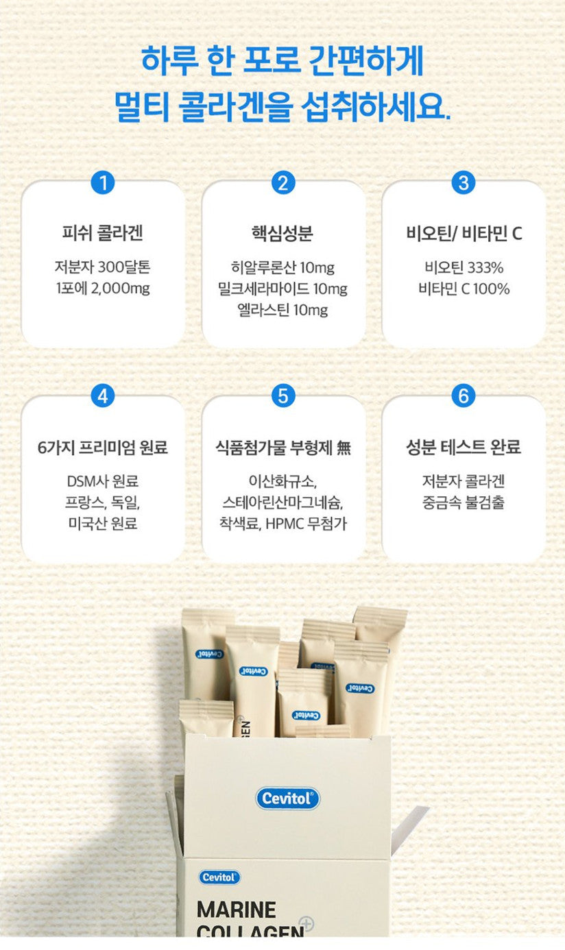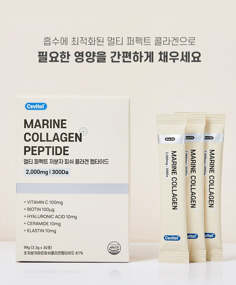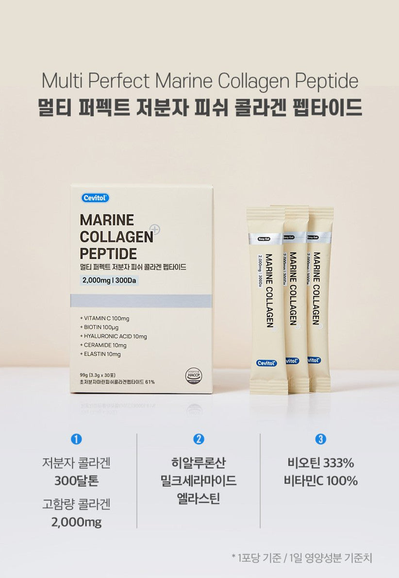 After trying Cevitol Multi Perfect Marine Collagen Peptide, I’ve been really impressed with the results. The low molecular weight collagen (300 Daltons) means it absorbs easily, and I felt a noticeable improvement in my skin’s elasticity after just a few weeks of use. Additionally, the inclusion of hyaluronic acid and biotin provided hydration that kept my skin looking plump. The blueberry flavor made taking it enjoyable without any fishy taste lingering afterward—very convenient for on-the-go care.