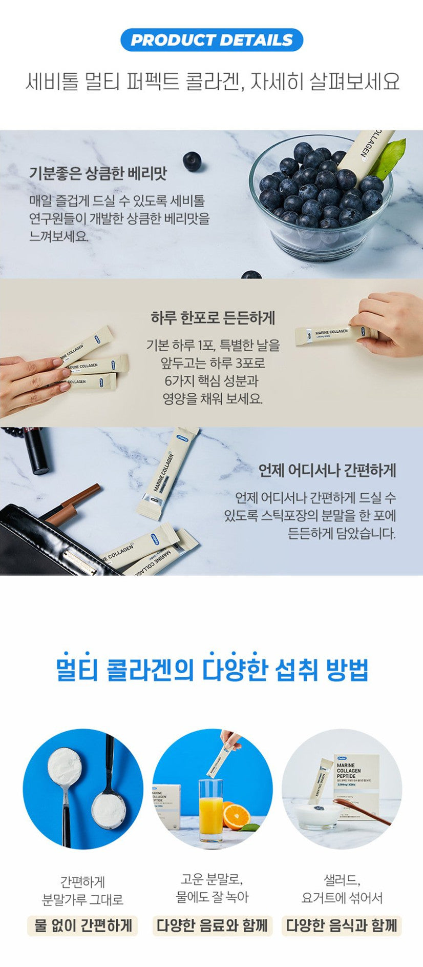 Meet the easy way to regain lost skin vitality with Multi Perfect Low Molecular Fish Collagen Peptide. It is a low-molecular-weight fish collagen created by enzymatic hydrolysis, so it has high absorption and is effective in balancing the skin. Made with blueberry flavor and scent, you can consume it without fishy taste, and it’s made in a small and thin pouch type, so it’s good to eat anytime, anywhere. Start simple care for healthy skin with Multi Perfect Low Molecular Fish Collagen Peptide made without adding chemical excipients.