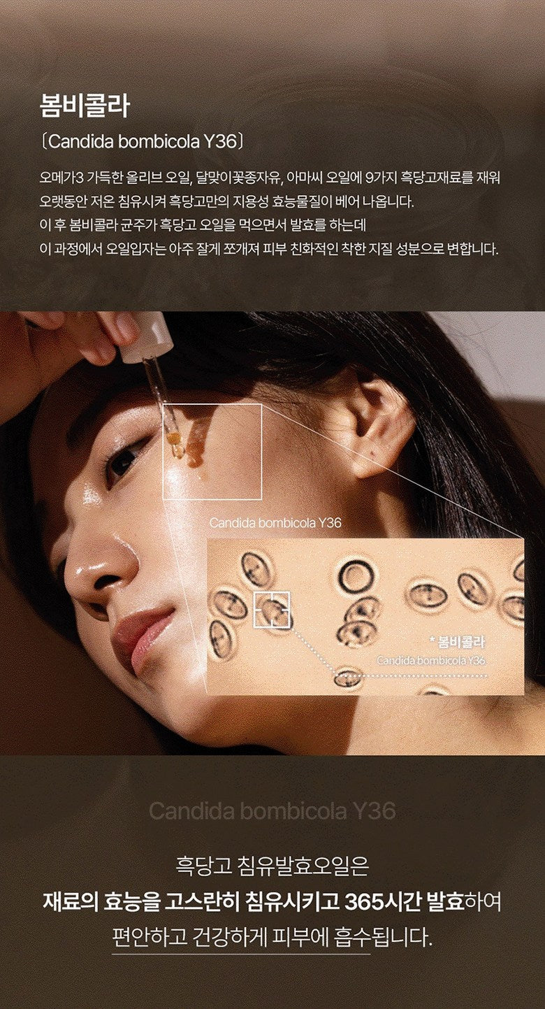 - By breaking down high molecular oil into skin-friendly lipids through the Bombicolla Y36 strain, the Omega-3 rich oils such as olive oil, evening primrose oil, and flaxseed oil are fermented with nine traditional ingredients, creating a finely-tuned lipid structure.