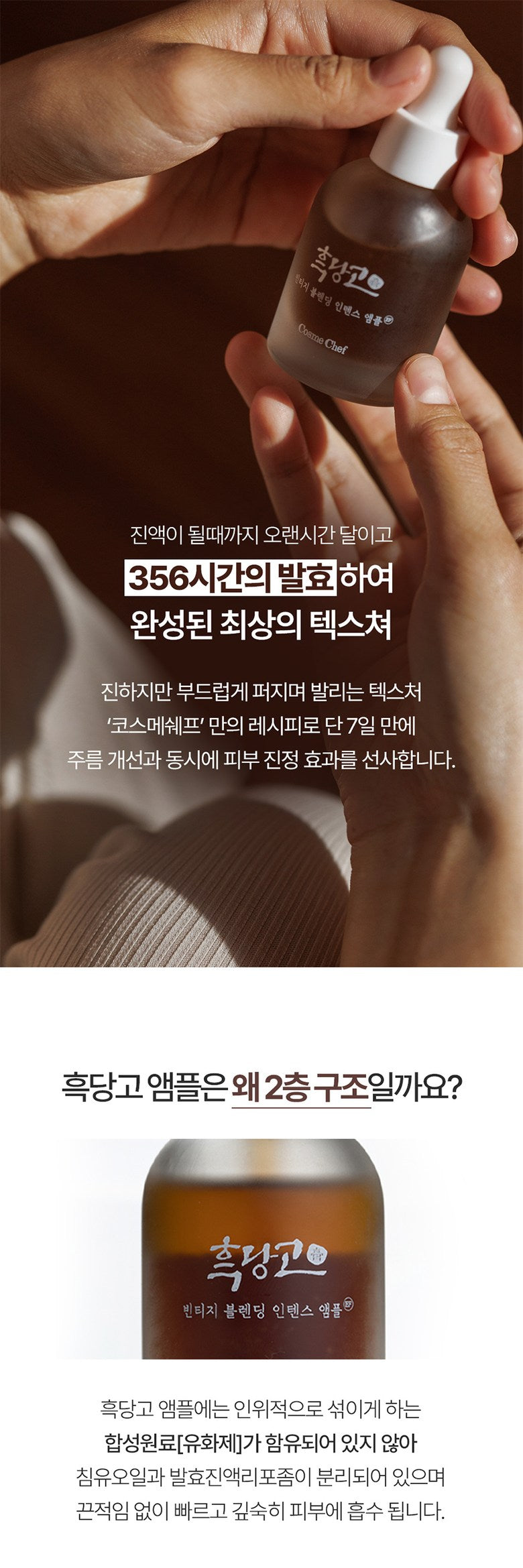 The Heukdango Ampoule features a unique two-layer formula that avoids synthetic emulsifiers, allowing the oil and the fermented essence liposomes to remain separate. This design ensures a non-sticky, rapid absorption into the skin.