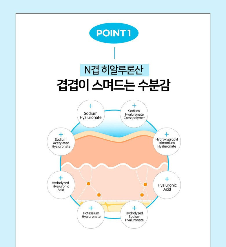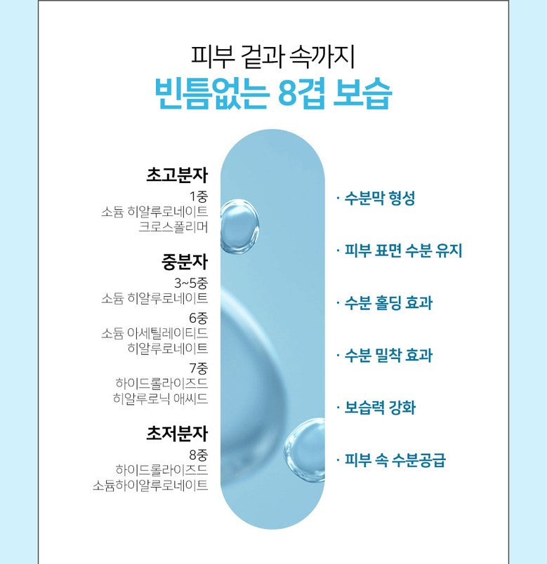 - 8-Layer Hyaluronic Acid, Jeju Bee Flower: Moisturizing, increasing moisture retention, and strengthening skin barrier