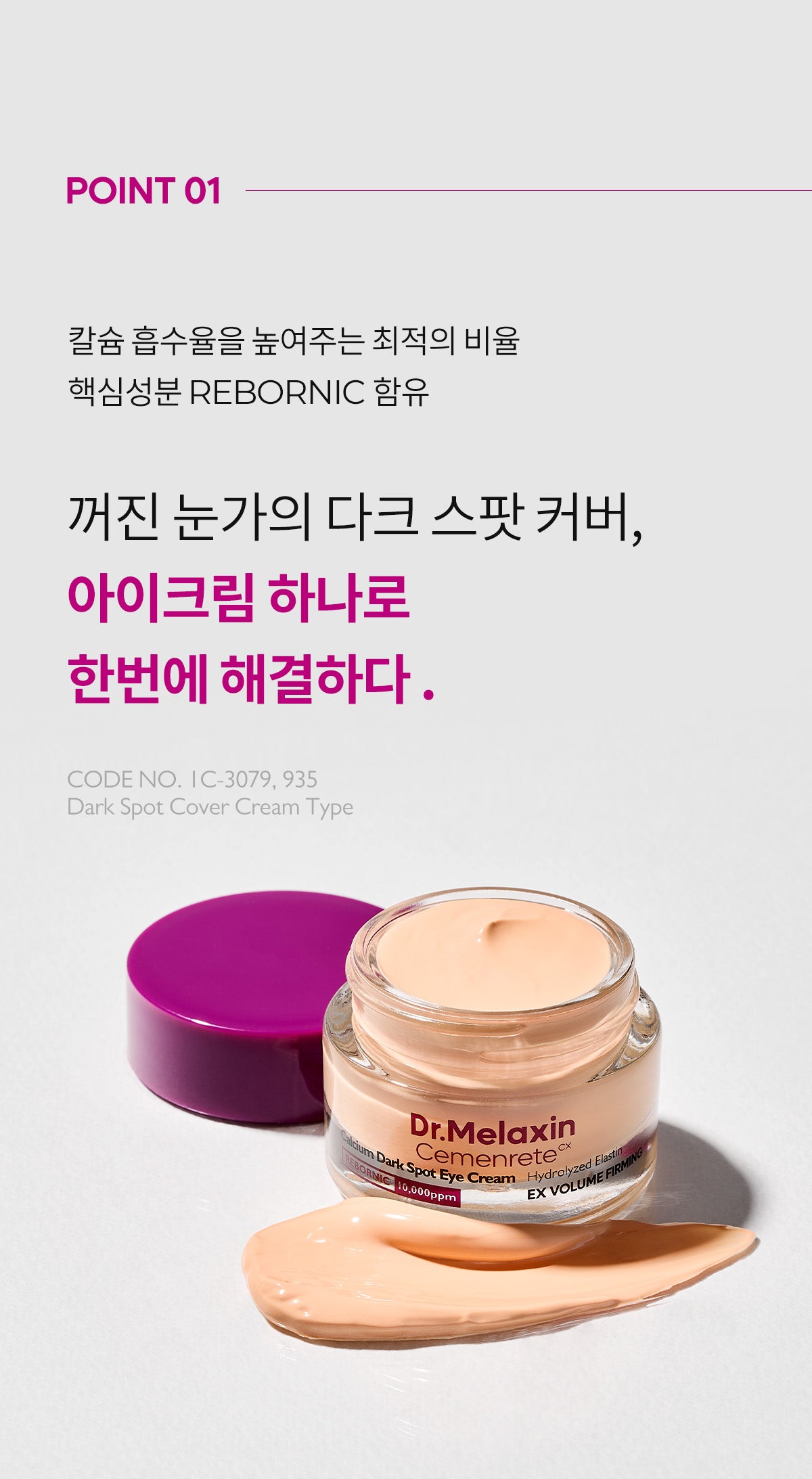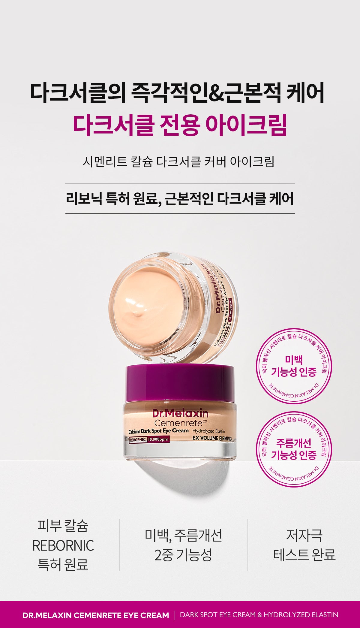 Transform your under-eye care routine with Cemenrete Calcium Dark Circle Cover Eye Cream, formulated with Rebonic’s patented raw material for revolutionary dark circle treatment. Combining instant coverage with long-term benefits, this dual-functional cosmetic is designed to provide whitening and wrinkle improvement while being gentle on your skin.