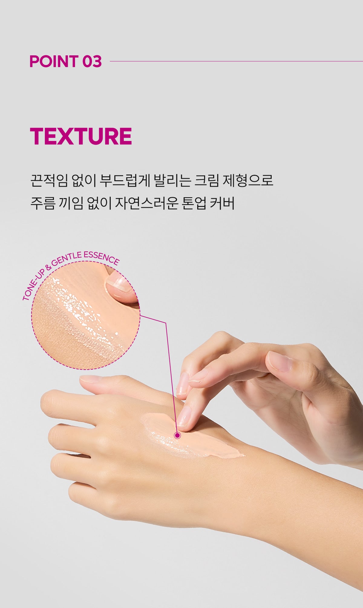 - Creamy formulation glides smoothly onto the skin without clumping or stickiness, providing a natural tone-up effect.