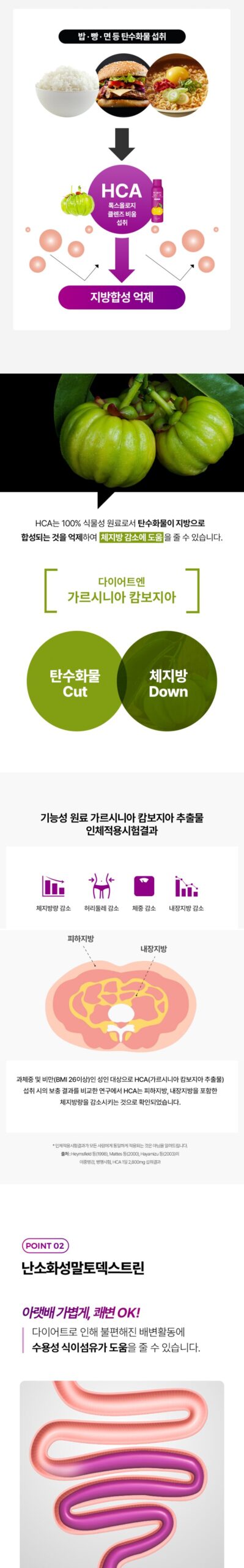 – **Garcinia Cambogia Extract (HCA)**: A 100% vegetable ingredient found in Garcinia Cambogia, HCA helps reduce body fat by suppressing the synthesis of carbohydrates into fat. It’s particularly effective when controlling the intake of carbs such as rice, bread, and noodles.