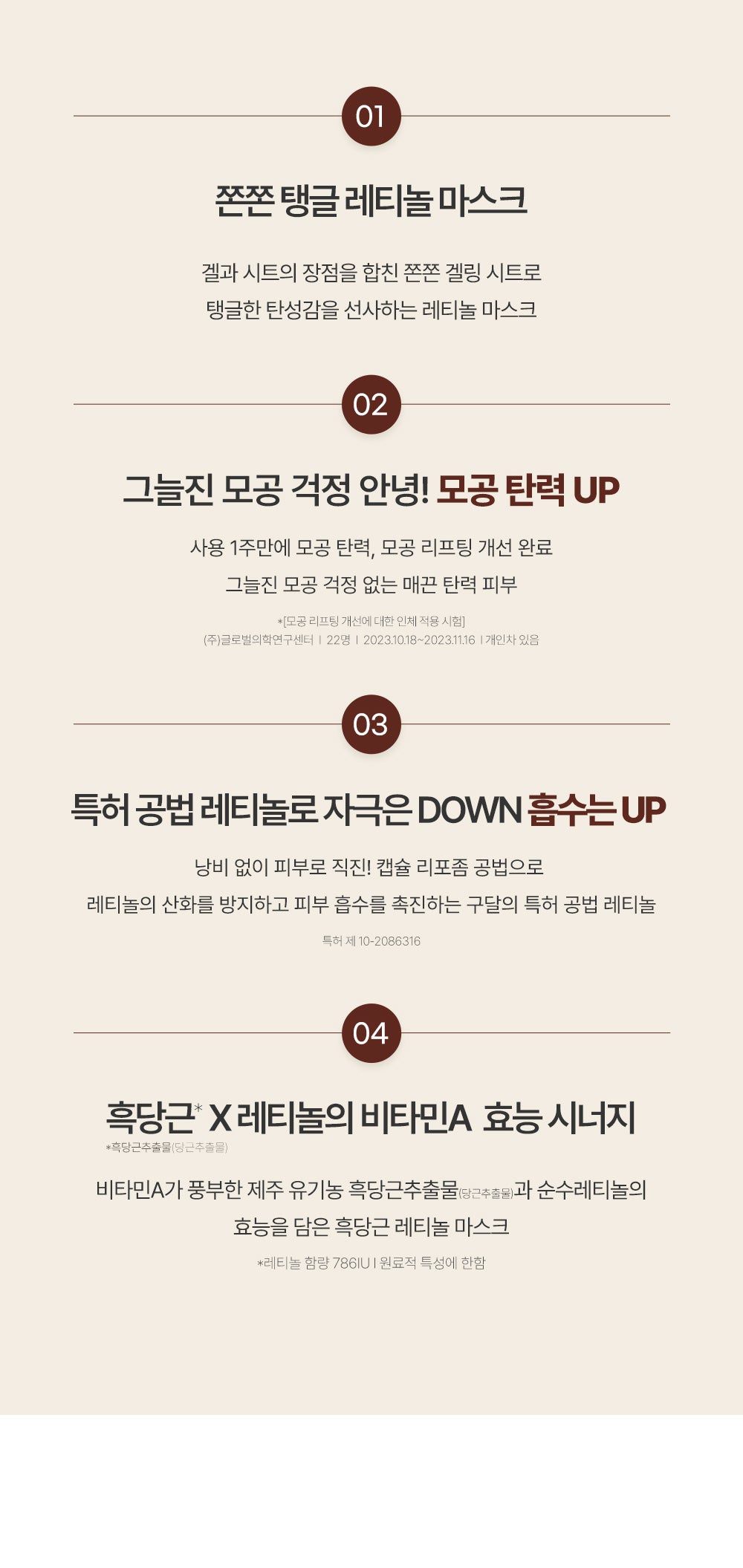 Jeju Black Carrot & Retinol Elasticity Recipe: The RETI-ROT™ Complex is rich in Vitamin A, featuring a blend of black carrot extract, beta carotene, retinol, and ectoin. The darker the carrot, the higher the concentration of anthocyanin, which aids in reducing oxidative stress. Our black carrot extract is freshly sourced and undergoes low-temperature aging with Jeju lava seawater for maximum potency.