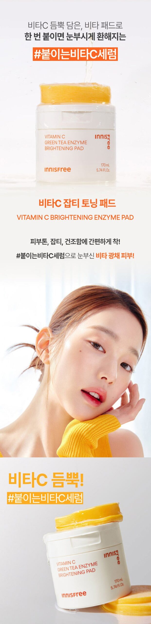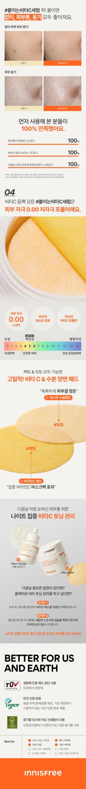 Yo! Just picked up these Innisfree Vitamin C pads and I’m kinda obsessed. Honestly, they feel so refreshing on my skin. I’m using the bamboo side first like a quick toner before applying that zesty vitamin C bit—it really brightens me right up after late nights! It’s not sticky at all either which is such a plus in this humidity of Toronto—big thumbs up for feeling light as air instead of caked with products you know? Plus, major bonus points for being eco-friendly too! These have become my go-to little glow-boosters!