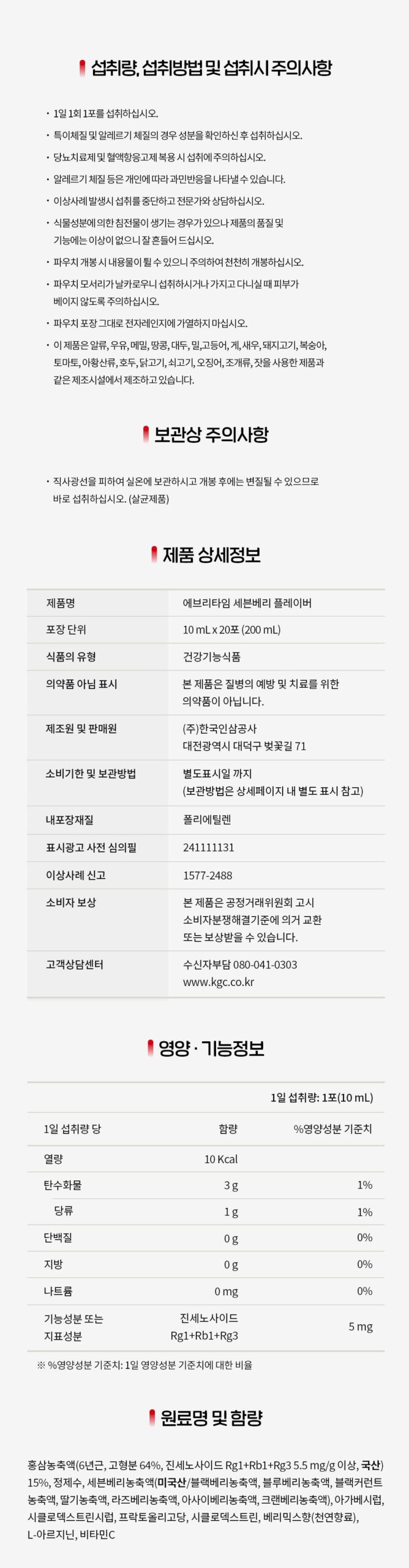 Red ginseng concentrate (6 years old, solid content 64%, ginsenoside Rg1+Rb1+Rg35.5 mg/g or more, domestic) 15%, purified water, seven berry concentrate (American/blackberry concentrate, blueberry concentrate, blackcurrant concentrate, strawberry concentrate, raspberry concentrate, acai berry concentrate, cranberry concentrate), agave syrup, cyclodextrin syrup, fructooligosaccharide, cyclodextrin, berry mix flavor (natural flavor), L-arginine, vitamin C
