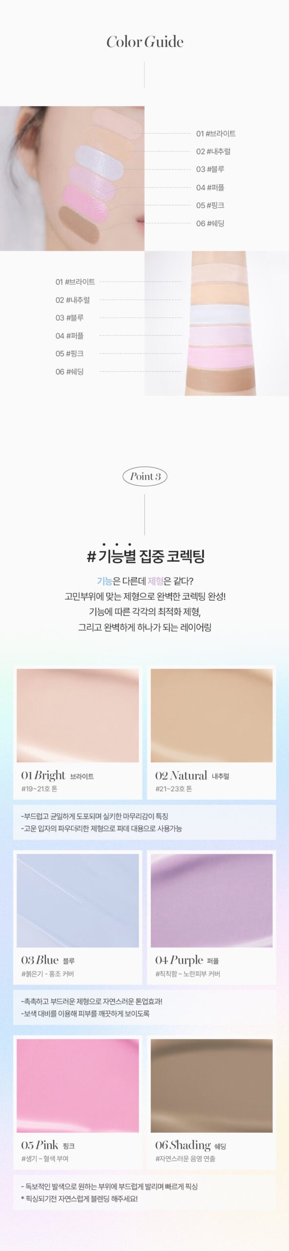- 01. Bright (19-21 tone): Ideal for dark circles, highlighting, and adding brightness.