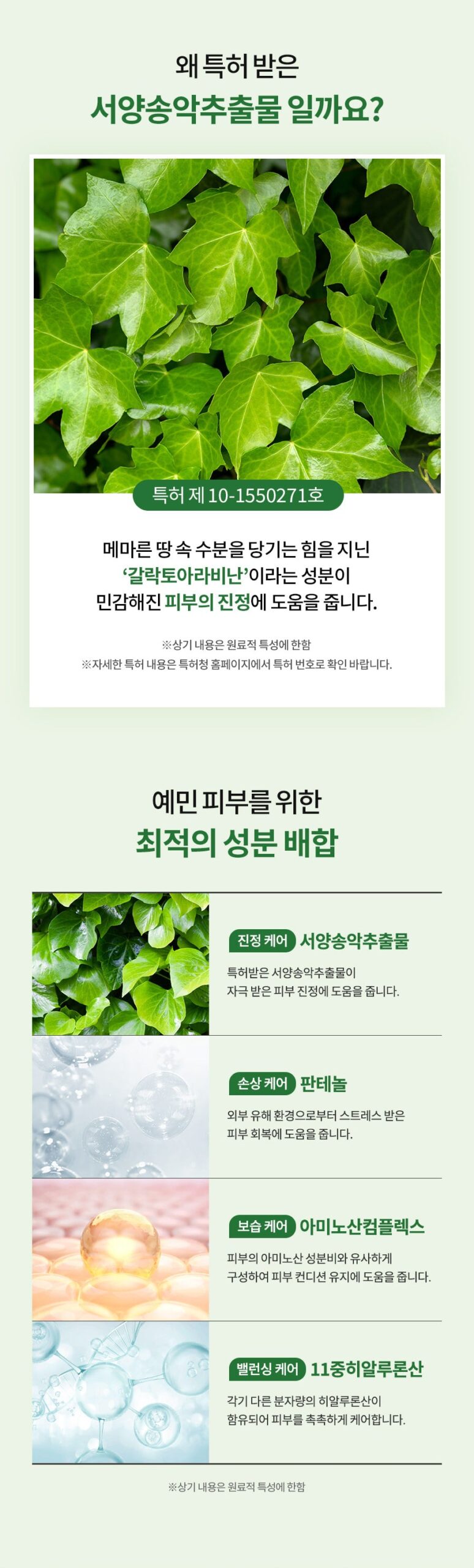 - Patent No. 10-1550271: A testament to our unique formula featuring Hedera Helix extract and galactoarabinan for soothing care.