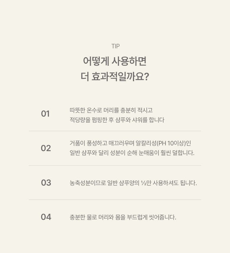 - Use only half the amount of regular shampoo due to the concentrated ingredients.