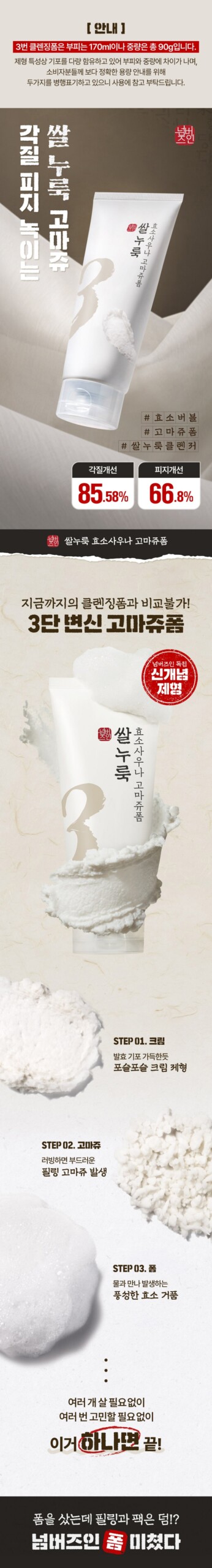 The Numbuzin No. 3 Rice Yeast Enzyme Sauna Gommage Foam effectively dissolves dead skin cells and sebum. Its enzyme bubbles penetrate deep into pores to cleanse impurities, providing a thorough 5-step cleansing routine that is unparalleled.
