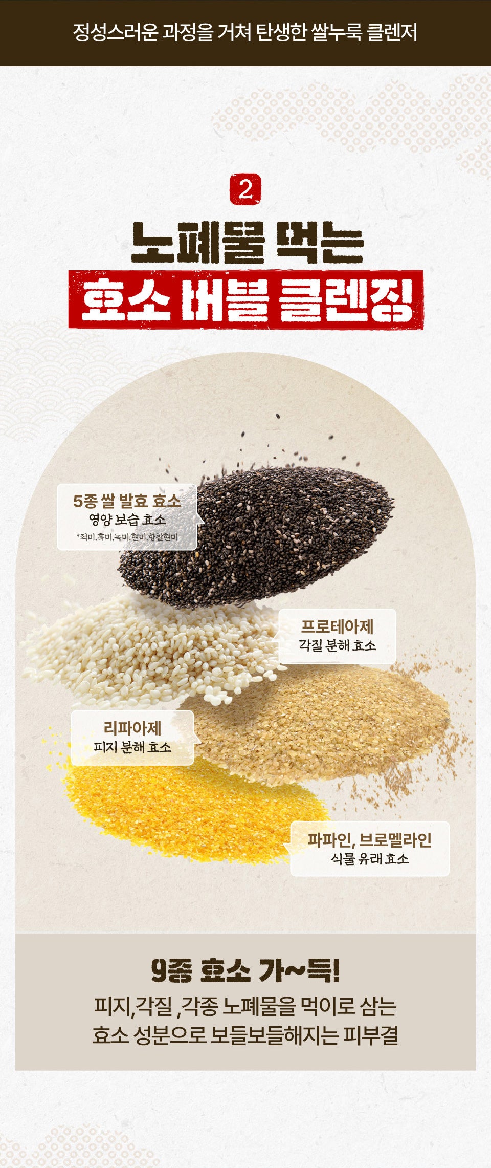 This gommage foam contains 5 types of rice ferment enzyme to nourish and moisturize the skin. It includes protease to decompose dead skin cells, lipase for sebum breakdown, and plant-based enzymes papain and bromelain for comprehensive exfoliation. These enzymes work together to consume sebum, dead skin cells, and skin wastes, leaving your skin soft and smooth.