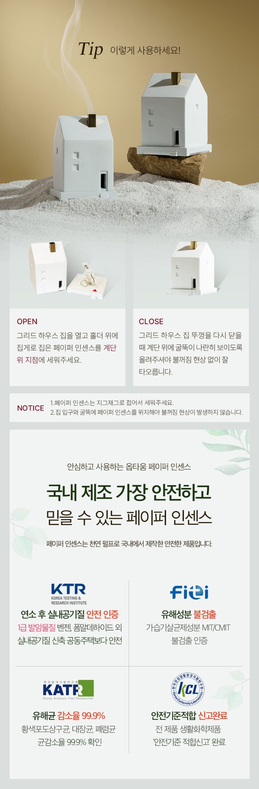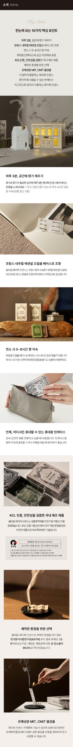 It is a product that has been certified for indoor air quality safety against first-class carcinogens (benzene, formaldehyde) as a result of an indoor air quality test after burning paper incense at the request of KTR (Korea Testing & Research Institute).
