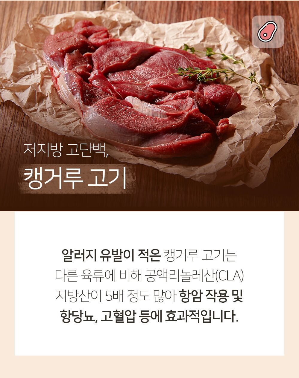 Kangaroo meat, which is less prone to allergens, contains 5 times more conjugated linoleic acid (CLA) fatty acids than other meats, so it is effective for anti-cancer, anti-diabetic and high blood pressure.