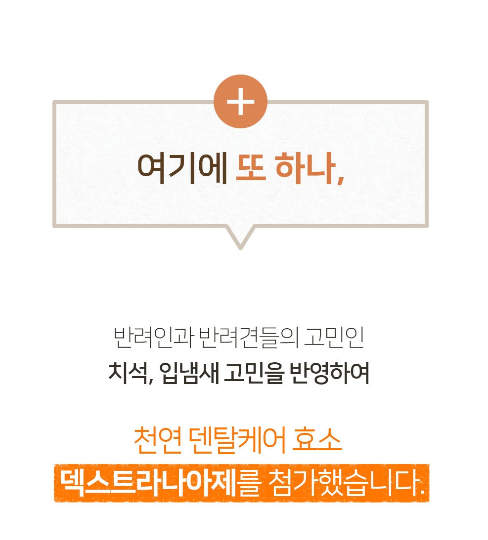 Dextranase, a natural dental care enzyme, has been added to reflect the concerns of pet owners and dogs, such as tartar and bad breath.