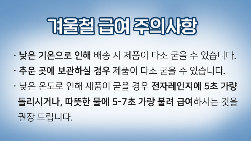 If the product hardens due to low temperature, it is recommended to microwave it for 5 seconds or soak it in warm water for 5-7 seconds.