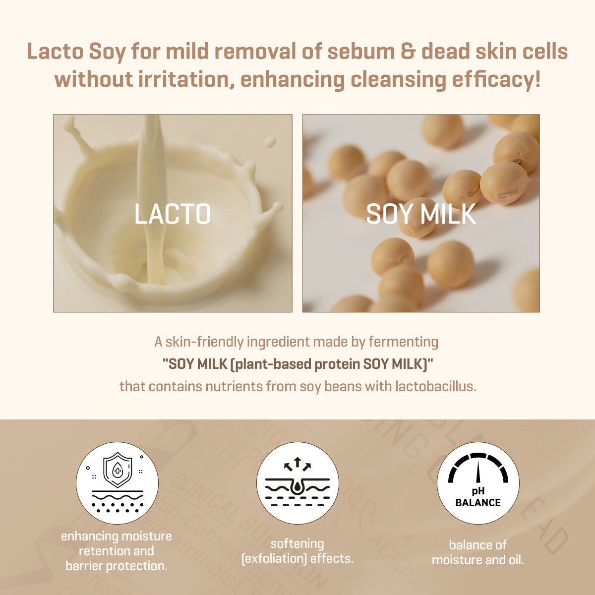 - Lacto Soy (Lactobacillus/Soymilk Ferment Filtrate): Gently melts away dead skin cells and blackheads while balancing skin moisture.