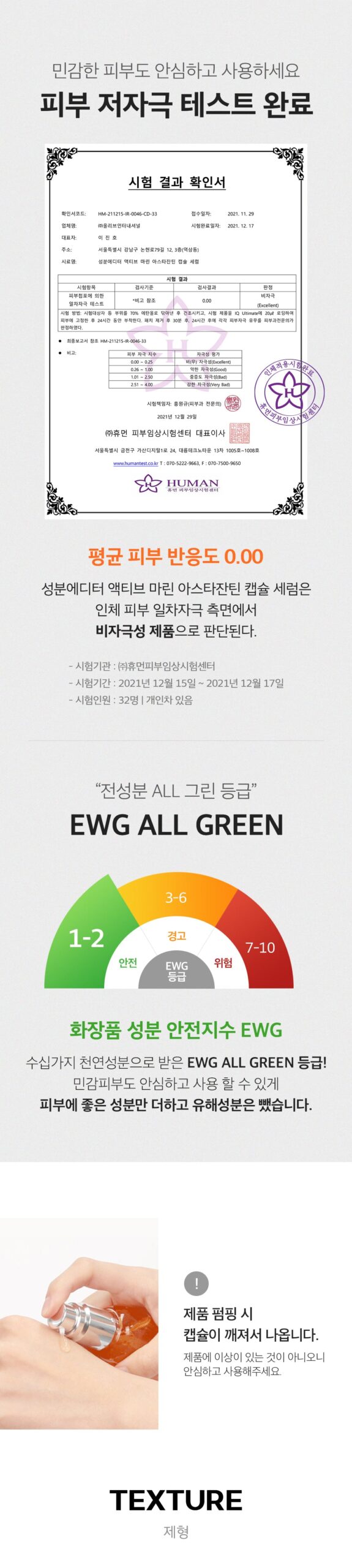 - Skin Hypoallergenicity: Passed skin hypoallergenic tests; all components are EWG ALL GREEN grade.