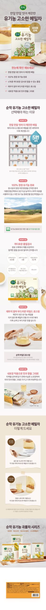 Our passion for quality and purity extends beyond buckwheat tea. The Soonjak Organic Grain Tea Series includes a variety of flavors such as Barley Tea, Corn Tea, and Corn Silk Tea. Each offering is crafted with the same dedication to organic ingredients and quality, providing a range of savory options for every palate.