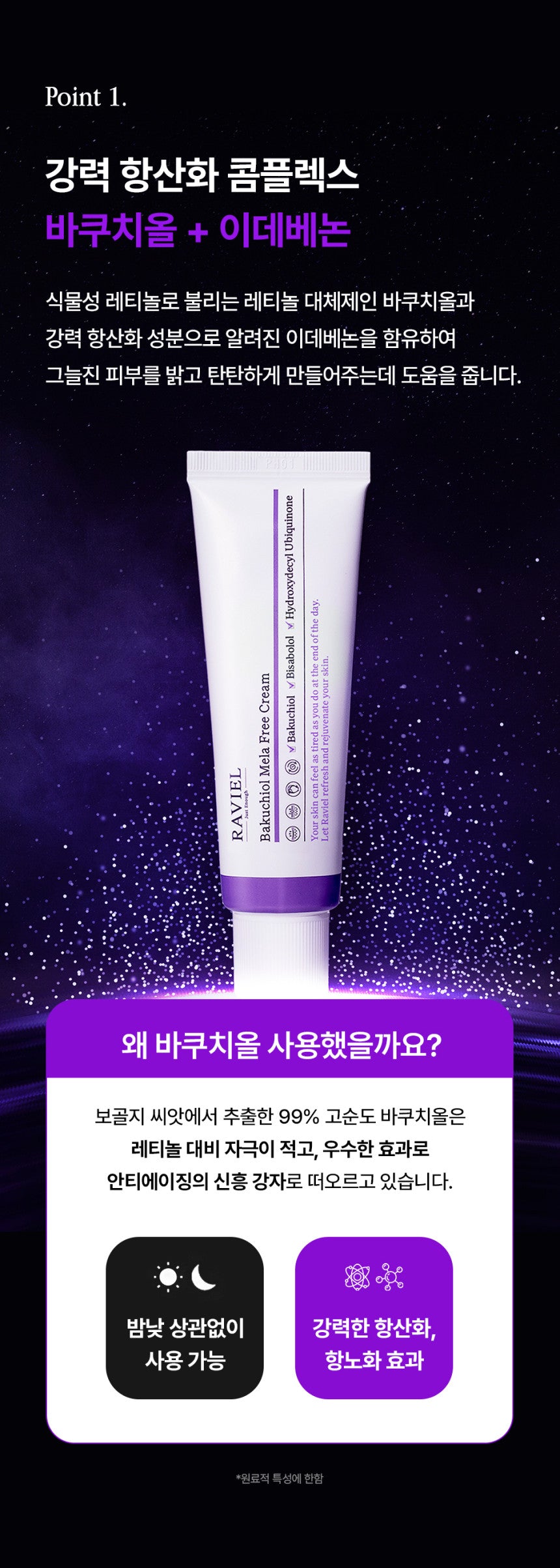 - Combines Bakuchiol and Idebenone, known for their brightening and firming effects.
