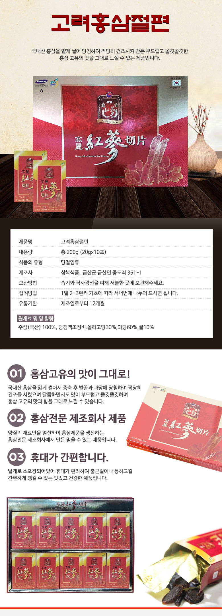 Produced by a specialized red ginseng manufacturer, this product is made using only high-quality, carefully selected ingredients. You can trust in the craftsmanship and expertise that go into every slice.